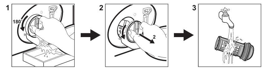 - Vyčitite odsávacie čerpadlo/filter, a potom spustite pranie horúcou vodou bez pracieho prášku.